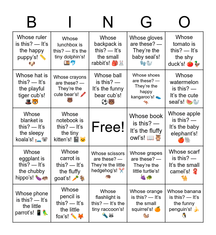 This bingo card has a free space and 30 words: Whose pencil is this? — It’s the little fox’s! ✏️🦊, Whose eraser is this? — It’s the baby panda’s! 🧽🐼, Whose notebook is this? — It’s the tiny kitten’s! 📓🐱, Whose pencil case is this? — It’s the silly monkey’s! 🎒🐵, Whose ruler is this? — It’s the happy puppy’s! 📏🐶, Whose backpack is this? — It’s the small rabbit’s! 🎒🐰, Whose crayons are these? — They’re the cute bear’s! 🖍️🐻, Whose scissors are these? — They’re the little hedgehog’s! ✂️🦔, Whose book is this? — It’s the fluffy owl’s! 📖🦉, Whose flashlight is this? — It’s the tiny raccoon’s! 🔦🦝, Whose apple is this? — It’s the baby elephant’s! 🍎🐘, Whose banana is this? — It’s the funny penguin’s! 🍌🐧, Whose orange is this? — It’s the small squirrel’s! 🍊🐿️, Whose persimmon is this? — It’s the happy deer’s! 🍊🦌, Whose watermelon is this? — It’s the cute seal’s! 🍉🦭, Whose strawberry is this? — It’s the tiny mouse’s! 🍓🐭, Whose grapes are these? — They’re the little turtle’s! 🍇🐢, Whose eggplant is this? — It’s the chubby hippo’s! 🍆🦛, Whose carrot is this? — It’s the fluffy goat’s! 🥕🐐, Whose tomato is this? — It’s the shy duck’s! 🍅🦆, Whose blanket is this? — It’s the sleepy koala’s! 🛏️🐨, Whose toothbrush is this? — It’s the silly crocodile’s! 🪥🐊, Whose lunchbox is this? — It’s the tiny dolphin’s! 🍱🐬, Whose shoes are these? — They’re the happy kangaroo’s! 👟🦘, Whose hat is this? — It’s the playful tiger cub’s! 🎩🐯, Whose gloves are these? — They’re the baby seal’s! 🧤🦭, Whose scarf is this? — It’s the small camel’s! 🧣🐪, Whose phone is this? — It’s the little parrot’s! 📱🦜, Whose ball is this? — It’s the funny bear cub’s! ⚽🐻 and Whose umbrella is this? — It’s the gentle cat’s! ☔🐱.