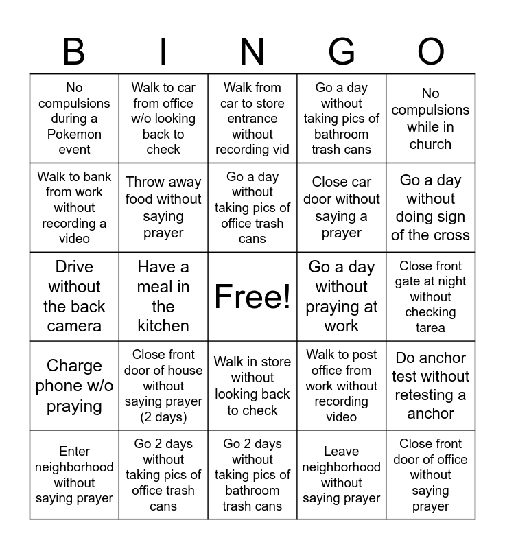 This bingo card has a free space and 24 words: Close front door of house without saying prayer (2 days), Go 2 days without taking pics of office trash cans, Go a day without taking pics of office trash cans, Enter neighborhood without saying prayer, No compulsions while in church, No compulsions during a Pokemon event, Walk to bank from work without recording a video, Walk to car from office w/o looking back to check, Go a day without praying at work, Walk in store without looking back to check, Close car door without saying a prayer, Drive without the back camera, Walk to post office from work without recording video, Do anchor test without retesting a anchor, Throw away food without saying prayer, Leave neighborhood without saying prayer, Close front gate at night without checking tarea, Walk from car to store entrance without recording vid, Go a day without doing sign of the cross, Have a meal in the kitchen, Close front door of office without saying prayer, Charge phone w/o praying, Go a day without taking pics of bathroom trash cans and Go 2 days without taking pics of bathroom trash cans.