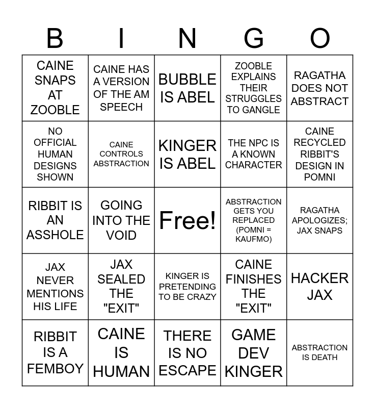 This bingo card has a free space and 24 words: JAX SEALED THE "EXIT", CAINE IS HUMAN, KINGER IS ABEL, RIBBIT IS A FEMBOY, RAGATHA DOES NOT ABSTRACT, CAINE SNAPS AT ZOOBLE, NO OFFICIAL HUMAN DESIGNS SHOWN, CAINE HAS A VERSION OF THE AM SPEECH, ABSTRACTION GETS YOU REPLACED (POMNI = KAUFMO), KINGER IS PRETENDING TO BE CRAZY, THE NPC IS A KNOWN CHARACTER, RIBBIT IS AN ASSHOLE, CAINE FINISHES THE "EXIT", HACKER JAX, CAINE CONTROLS ABSTRACTION, GAME DEV KINGER, RAGATHA APOLOGIZES; JAX SNAPS, BUBBLE IS ABEL, CAINE RECYCLED RIBBIT'S DESIGN IN POMNI, GOING INTO THE VOID, ABSTRACTION IS DEATH, JAX NEVER MENTIONS HIS LIFE, ZOOBLE EXPLAINS THEIR STRUGGLES TO GANGLE and THERE IS NO ESCAPE.