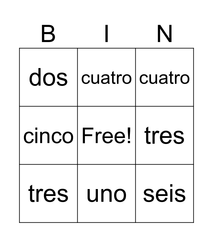 This bingo card has a free space and 13 words: uno, dos, tres, cuatro, cinco, seis, siete, ocho, uno, dos, tres, cuatro and cinco.