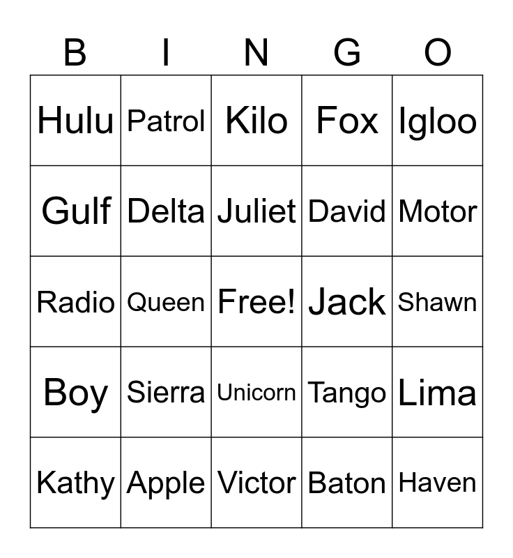 This bingo card has a free space and 60 words: Alpha, Apple, Bravo, Boy, Baton, Charlie, Delta, Dog, David, Echo, Fox, Family, Gulf, Google, Hotel, Hulu, Haven, Igloo, India, Juliet, Jack, Kilo, Kathy, Lima, Lock, Lemon, Mike, Motel, Motor, November, Nancy, Oscar, Open, Papa, Patrol, Portugal, Quebec, Queen, Romeo, Radio, Radical, Sierra, Shawn, Suspect, Tango, Tailgate, Thomas, Uniform, Umbrella, Unicorn, Victor, Whiskey, William, Xray, Xylophone, Yankee, Yolo, Yellow, Zulu and Zebra.
