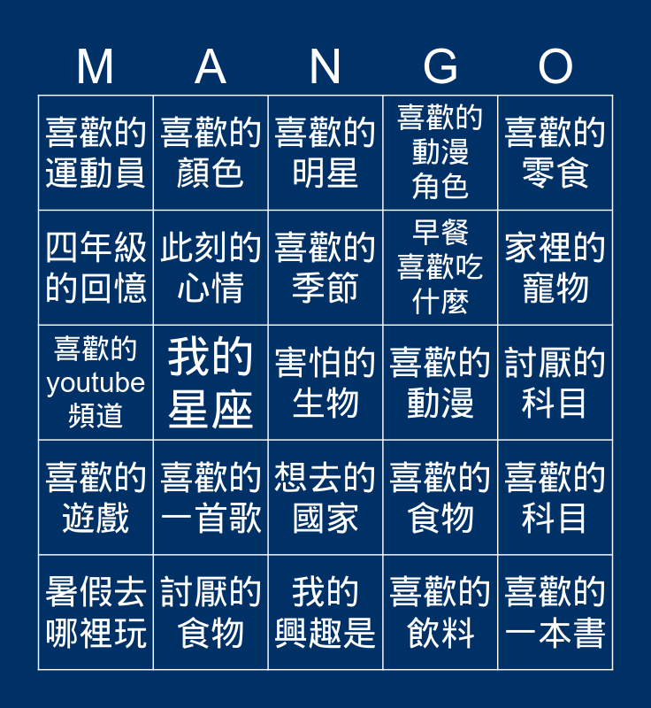This bingo card has 25 words: 喜歡的一首歌, 我的 興趣是, 喜歡的季節, 暑假去哪裡玩, 喜歡的零食, 喜歡的運動員, 四年級的回憶, 喜歡的顏色, 喜歡的動漫, 想去的國家, 早餐 喜歡吃 什麼, 喜歡的youtube頻道, 喜歡的食物, 喜歡的科目, 此刻的心情, 喜歡的一本書, 討厭的科目, 喜歡的明星, 家裡的寵物, 我的星座, 害怕的生物, 討厭的食物, 喜歡的遊戲, 喜歡的動漫 角色 and 喜歡的飲料.