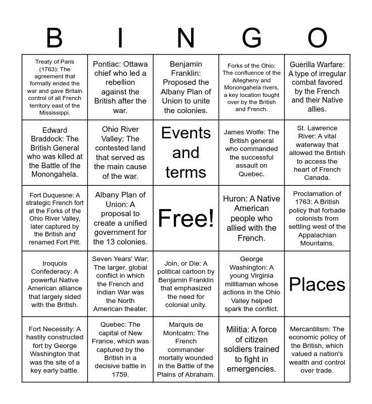 This bingo card has a free space and 27 words: George Washington: A young Virginia militiaman whose actions in the Ohio Valley helped spark the conflict., William Pitt: The British Secretary of State who turned the tide of the war by committing more resources to North America., James Wolfe: The British general who commanded the successful assault on Quebec., Marquis de Montcalm: The French commander mortally wounded in the Battle of the Plains of Abraham., Edward Braddock: The British General who was killed at the Battle of the Monongahela., Benjamin Franklin: Proposed the Albany Plan of Union to unite the colonies., Pontiac: Ottawa chief who led a rebellion against the British after the war., Iroquois Confederacy: A powerful Native American alliance that largely sided with the British., Huron: A Native American people who allied with the French., Places, Fort Duquesne: A strategic French fort at the Forks of the Ohio River Valley, later captured by the British and renamed Fort Pitt., Forks of the Ohio: The confluence of the Allegheny and Monongahela rivers, a key location fought over by the British and French., Fort Necessity: A hastily constructed fort by George Washington that was the site of a key early battle., Quebec: The capital of New France, which was captured by the British in a decisive battle in 1759., St. Lawrence River: A vital waterway that allowed the British to access the heart of French Canada., Louisbourg: A large French fortress on Cape Breton Island that was captured by the British., Ohio River Valley: The contested land that served as the main cause of the war., Events and terms, Seven Years' War: The larger, global conflict in which the French and Indian War was the North American theater., Treaty of Paris (1763): The agreement that formally ended the war and gave Britain control of all French territory east of the Mississippi., Proclamation of 1763: A British policy that forbade colonists from settling west of the Appalachian Mountains., Militia: A force of citizen soldiers trained to fight in emergencies., Albany Plan of Union: A proposal to create a unified government for the 13 colonies., Mercantilism: The economic policy of the British, which valued a nation's wealth and control over trade., Join, or Die: A political cartoon by Benjamin Franklin that emphasized the need for colonial unity., Guerilla Warfare: A type of irregular combat favored by the French and their Native allies. and Salutary Neglect: The unofficial British policy of relaxed enforcement of trade laws in the American colonies, which ended after the war..