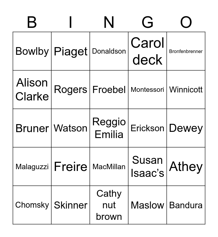 This bingo card has a free space and 24 words: Freire, Skinner, Froebel, Chomsky, Bronfenbrenner, Bowlby, Alison Clarke, Piaget, Erickson, MacMillan, Montessori, Bruner, Susan Isaac’s, Athey, Rogers, Maslow, Dewey, Donaldson, Winnicott, Watson, Bandura, Malaguzzi, Carol deck and Cathy nut brown.
