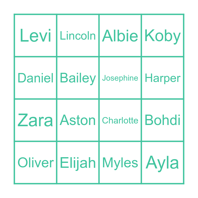 This bingo card has 26 words: Lucy, Braxton, Harper, Blaize, Daniel, Levi, Bailey, Lincoln, Myles, Maeve, Zara, Charlotte, Sofia, Tyler, Bohdi, Ava, Koby, Ayla, Albie, Oliver, Aston, Arria, Elijah, Billie, Josephine and Damon.
