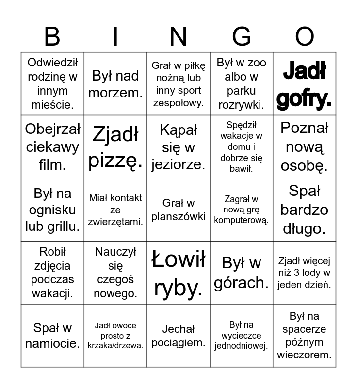 This bingo card has 25 words: Nauczył się czegoś nowego., Jechał pociągiem., Kąpał się w jeziorze., Spał w namiocie., Jadł gofry., Odwiedził rodzinę w innym mieście., Obejrzał ciekawy film., Był nad morzem., Zagrał w nową grę komputerową., Łowił ryby., Spędził wakacje w domu i dobrze się bawił., Był na ognisku lub grillu., Był w górach., Zjadł więcej niż 3 lody w jeden dzień., Zjadł pizzę., Był na spacerze późnym wieczorem., Spał bardzo długo., Grał w piłkę nożną lub inny sport zespołowy., Poznał nową osobę., Miał kontakt ze zwierzętami., Grał w planszówki, Jadł owoce prosto z krzaka/drzewa., Robił zdjęcia podczas wakacji., Był w zoo albo w parku rozrywki. and Był na wycieczce jednodniowej..