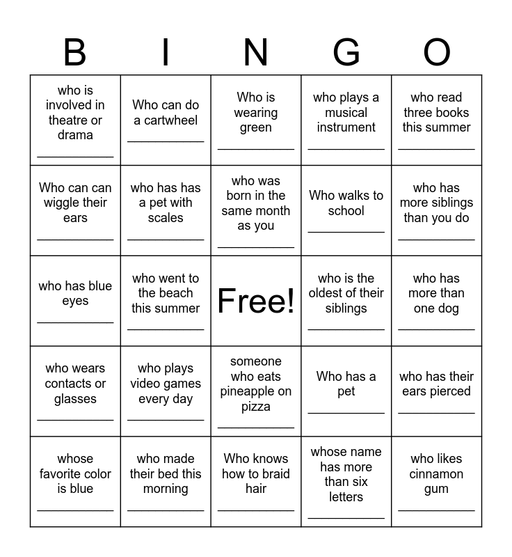 This bingo card has a free space and 27 words: Who has a pet ___________, Who has a summer birthday ___________, Who walks to school ___________, Who knows how to braid hair ___________, Who can can wiggle their ears ___________, Who is wearing green ___________, Who can do a cartwheel ___________, who wears contacts or glasses ___________, who is the oldest of their siblings ___________, who has their ears pierced ___________, who has blue eyes ___________, who plays a musical instrument ___________, whose favorite color is blue ___________, who made their bed this morning ___________, who has more siblings than you do ___________, who wears socks with sandals ___________, who has has a pet with scales ___________, who was born in the same month as you ___________, who plays video games every day ___________, who is involved in theatre or drama ___________, who has more than one dog ___________, whose name has more than six letters ___________, who went to the beach this summer ___________, who likes cinnamon gum ___________, someone who eats pineapple on pizza ___________, who read three books this summer ___________ and who likes to play chess ___________.