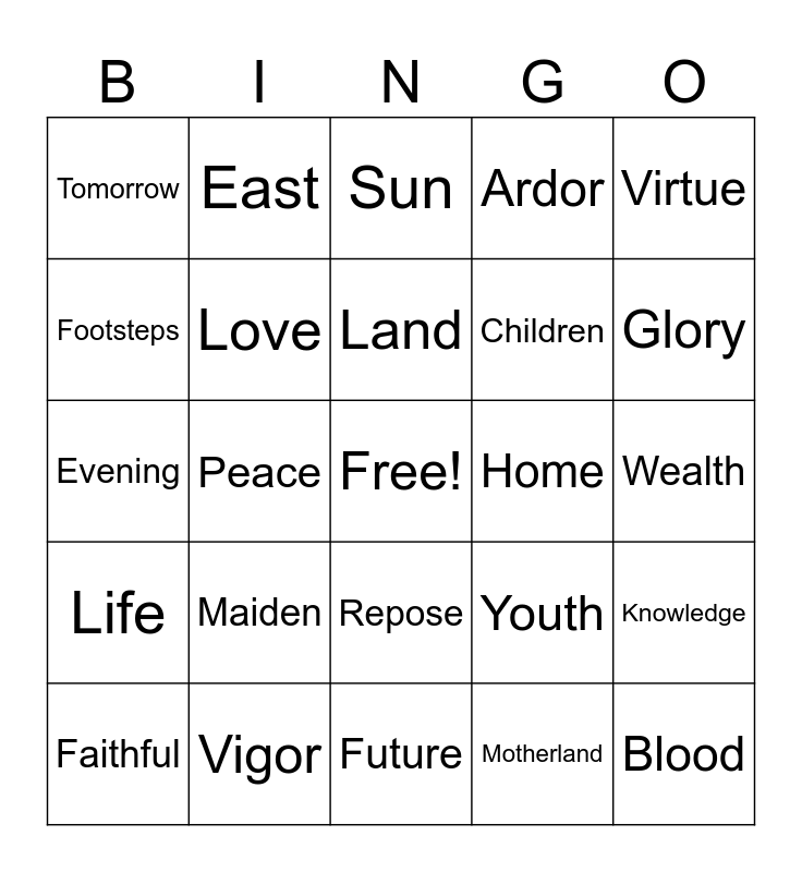 This bingo card has a free space and 32 words: Motherland, Labor, Peace, War, Life, Love, Virtue, Knowledge, East, Field, Land, Sun, Family, Children, Home, Wife, Faithful, Evening, Repose, Maiden, Youth, Praise, Wealth, Vigor, Blood, Ardor, Children, Footsteps, Tomorrow, Future, Valor and Glory.