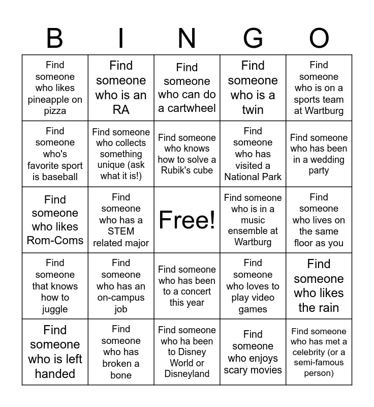 This bingo card has a free space and 39 words: Find someone who knows how to whistle, Find someone who can play the guitar, Find someone who knows how to speak more than one language, Find someone who collects something unique (ask what it is!), Find someone who is left handed, Find someone who has been to a concert this year, Find someone who knows how to solve a Rubik's cube, Find someone who has a birthday this month, Find someone who is on a sports team at Wartburg, Find someone that knows how to juggle, Find someone who has a STEM related major, Find someone who is a twin, Find someone who has met a celebrity (or a semi-famous person), Find someone who lives on the same floor as you, Find someone who is in a music ensemble at Wartburg, Find someone who has an on-campus job, Find someone who's favorite color is purple, Find someone who likes pineapple on pizza, Find someone who knows how to crochet/knit, Find someone who loves to play video games, Find someone who's favorite sport is baseball, Find someone who ha been to Disney World or Disneyland, Find someone who has visited a National Park, Find someone who has been in a wedding party, Find someone who can wiggle their ears, Find someone who is an only child, Find someone who likes ice cream, Find someone who likes spicy food, Find someone who LOVES chocolate, Find someone who is an RA, Find someone who's favorite holiday is Thanksgiving, Find someone who shares the same first initial as you, Find someone who can do a cartwheel, Find someone who has broken a bone, Find someone who enjoys scary movies, Find someone who has an unusual pet (and what is it?), Find someone who likes the rain, Find someone who likes Rom-Coms and Find someone who enjoys musicals.