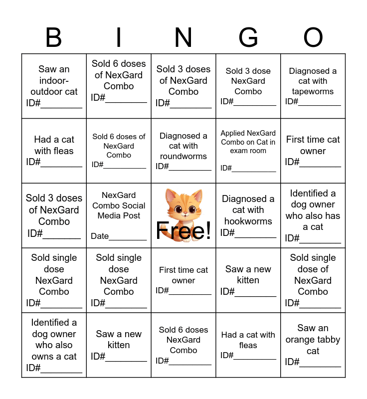 This bingo card has a free space and 24 words: Sold single dose NexGard Combo ID#________, Saw a new kitten ID#________, Diagnosed a cat with roundworms ID#_________, Identified a dog owner who also owns a cat ID#________, Diagnosed a cat with tapeworms ID#_________, Saw an indoor-outdoor cat ID#________, Had a cat with fleas ID#________, Sold 6 doses of NexGard Combo ID#________, Diagnosed a cat with hookworms ID#________, First time cat owner ID#_________, Applied NexGard Combo on Cat in exam room ID#___________, Sold 3 doses of NexGard Combo ID#_______, Saw a new kitten ID#________, Sold single dose of NexGard Combo ID#________, Sold 6 doses of NexGard Combo ID#__________, Had a cat with fleas ID#_________, Identified a dog owner who also has a cat ID#________, Sold 3 doses of NexGard Combo ID#________, First time cat owner ID#________, NexGard Combo Social Media Post Date________, Saw an orange tabby cat ID#________, Sold single dose NexGard Combo ID#________, Sold 3 dose NexGard Combo ID#_________ and Sold 6 doses NexGard Combo ID#_________.