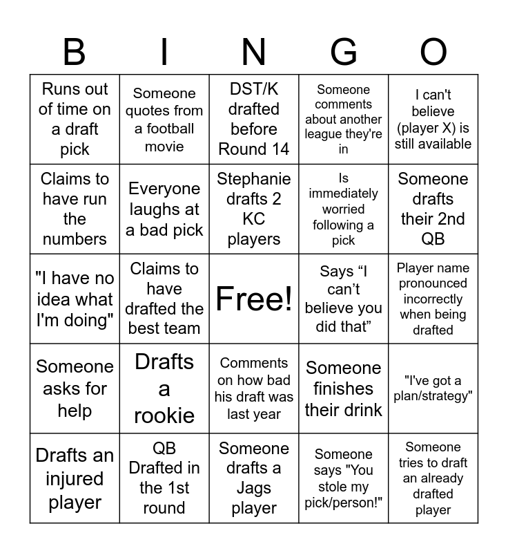 This bingo card has a free space and 24 words: Drafts a rookie, QB Drafted in the 1st round, Stephanie drafts 2 KC players, Drafts an injured player, I can't believe (player X) is still available, Runs out of time on a draft pick, Claims to have run the numbers, Someone quotes from a football movie, Says “I can’t believe you did that”, Comments on how bad his draft was last year, Is immediately worried following a pick, "I have no idea what I'm doing", Someone finishes their drink, "I've got a plan/strategy", Everyone laughs at a bad pick, Someone says "You stole my pick/person!", Player name pronounced incorrectly when being drafted, DST/K drafted before Round 14, Someone drafts their 2nd QB, Claims to have drafted the best team, Someone tries to draft an already drafted player, Someone asks for help, Someone comments about another league they're in and Someone drafts a Jags player.