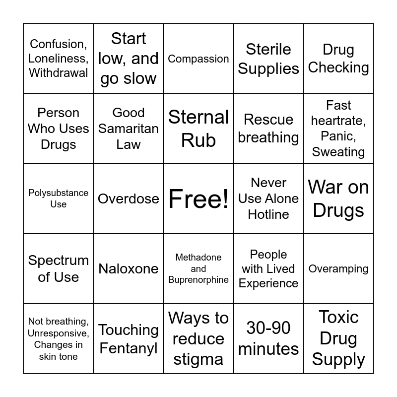 This bingo card has a free space and 24 words: Naloxone, Touching Fentanyl, Sternal Rub, Not breathing, Unresponsive, Changes in skin tone, Drug Checking, Confusion, Loneliness, Withdrawal, Person Who Uses Drugs, Start low, and go slow, Never Use Alone Hotline, Methadone and Buprenorphine, Rescue breathing, Polysubstance Use, People with Lived Experience, Overamping, Good Samaritan Law, 30-90 minutes, War on Drugs, Compassion, Fast heartrate, Panic, Sweating, Overdose, Toxic Drug Supply, Spectrum of Use, Sterile Supplies and Ways to reduce stigma.