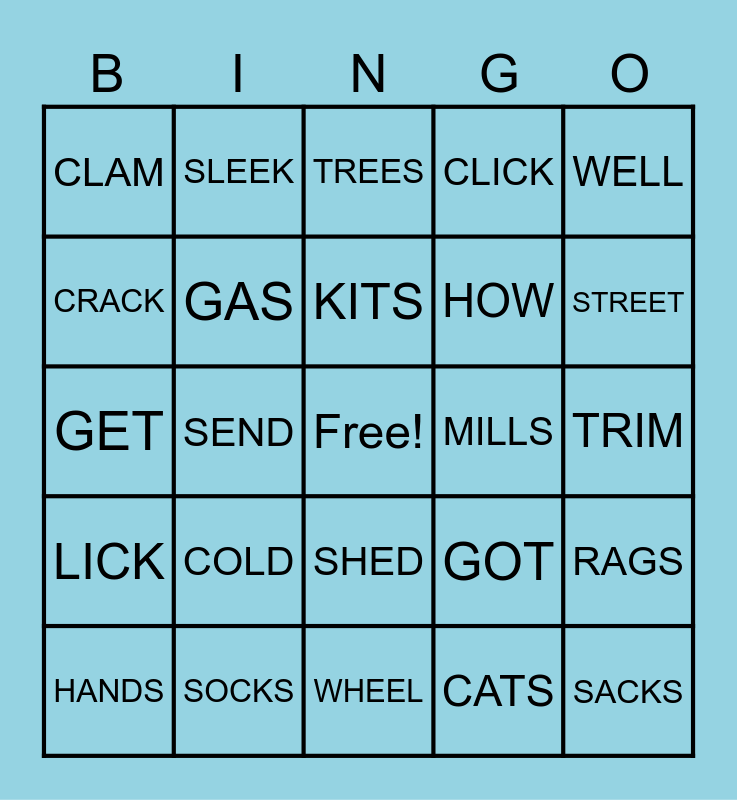 This bingo card has a free space and 24 words: COLD, SOCKS, KITS, HANDS, WELL, CLAM, CRACK, SLEEK, MILLS, SHED, HOW, GET, GOT, RAGS, GAS, CATS, TRIM, TREES, STREET, SEND, SACKS, LICK, CLICK and WHEEL.