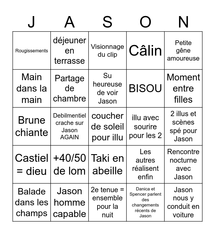 This bingo card has a free space and 24 words: +40/50 de lom, Jason homme capable, Su heureuse de voir Jason, Balade dans les champs, Petite gêne amoureuse, Rougissements, Main dans la main, déjeuner en terrasse, illu avec sourire pour les 2, Taki en abeille, BISOU, Brune chiante, Les autres réalisent enfin, Rencontre nocturne avec Jason, Partage de chambre, Danica et Spencer parlent des changements récents de Jason, 2 illus et scènes spé pour Jason, Visionnage du clip, Moment entre filles, Debilmentiel crache sur Jason AGAIN, Jason nous y conduit en voiture, Castiel = dieu, Câlin and 2e tenue = ensemble pour la nuit.