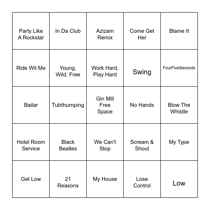 This bingo card has a free space and 48 words: Hot in Herre, Low, Party Rock Anthem, My House, Black Beatles, Bartender, In Da Club, Good Life, Ride Wit Me, 1,2 Step, Young, Wild, Free, Come Get Her, My Type, Scream & Shout, GDFR, Say Aah!, Work Hard, Play Hard, No Hands, Ignition Remix, Blame It, Tubthumping, Lose Control, Party Like A Rockstar, Swing, Party Up, FourFiveSeconds, Get Low, Pop Champagne, We Can't Stop, Hotel Room Service, Love Tonight, No Broke Boys, NOKIA, Squabble Up, 21 Reasons, Cry For Me, My Boo- club remix, Blow The Whistle, WHATCHU KNO ABOUT ME, Blessings, The Days, Shake it to the Max, Azizam Remix, For Free, Bailar, Atmosphere, Tití Me Preguntó and Yukon Remix.
