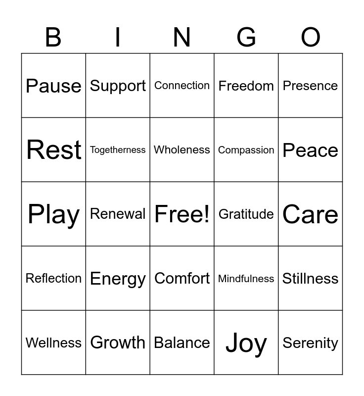 This bingo card has a free space and 31 words: Balance, Harmony, Renewal, Restoration, Pause, Connection, Togetherness, Mindfulness, Gratitude, Joy, Care, Serenity, Family, Friendship, Peace, Laughter, Stillness, Energy, Reflection, Comfort, Presence, Nature, Wellness, Support, Compassion, Rest, Freedom, Play, Growth, Wholeness and Recharge.