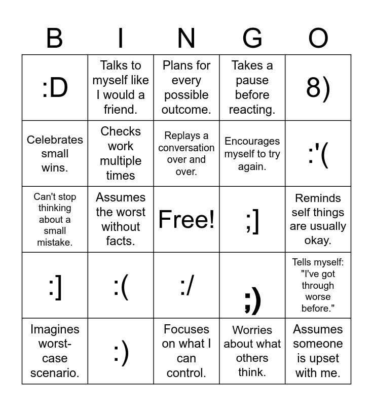 This bingo card has a free space and 24 words: Imagines worst-case scenario., :(, Replays a conversation over and over., Worries about what others think., 8), :D, Talks to myself like I would a friend., Plans for every possible outcome., ;], Reminds self things are usually okay., Can't stop thinking about a small mistake., Checks work multiple times, ;), Tells myself: "I've got through worse before.", Celebrates small wins., :), Focuses on what I can control., Takes a pause before reacting., :'(, :], Assumes the worst without facts., :/, Encourages myself to try again. and Assumes someone is upset with me..