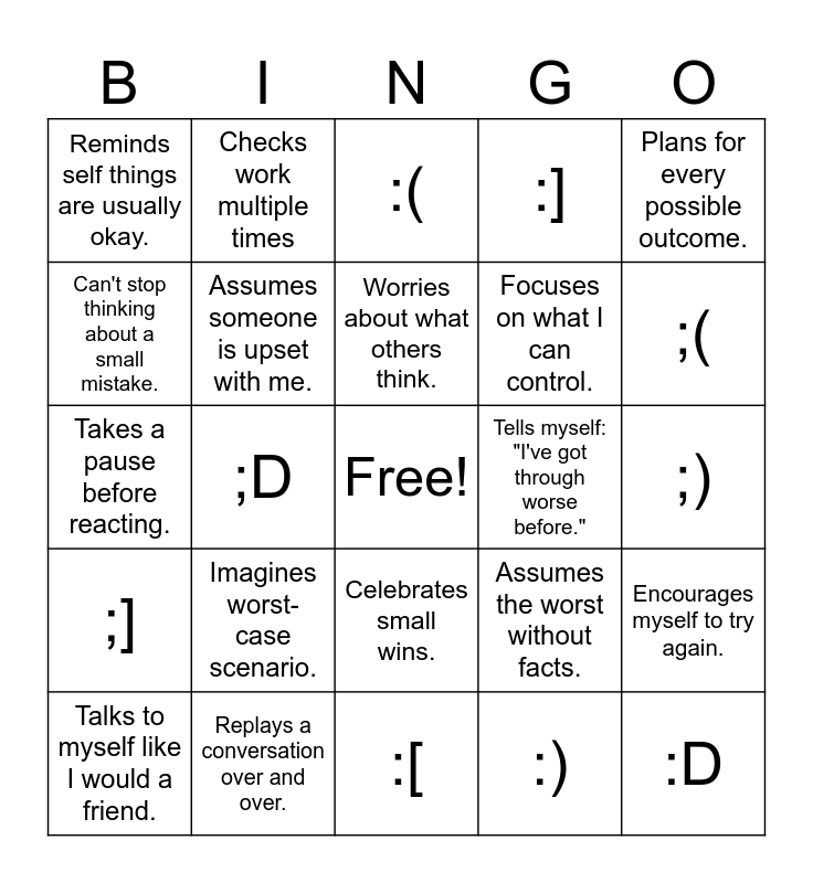 This bingo card has a free space and 24 words: Imagines worst-case scenario., Replays a conversation over and over., Worries about what others think., Talks to myself like I would a friend., Plans for every possible outcome., Reminds self things are usually okay., Can't stop thinking about a small mistake., Checks work multiple times, Tells myself: "I've got through worse before.", Celebrates small wins., Focuses on what I can control., Takes a pause before reacting., Assumes the worst without facts., Encourages myself to try again., Assumes someone is upset with me., :), ;), :(, ;(, ;D, :D, ;], :] and :[.