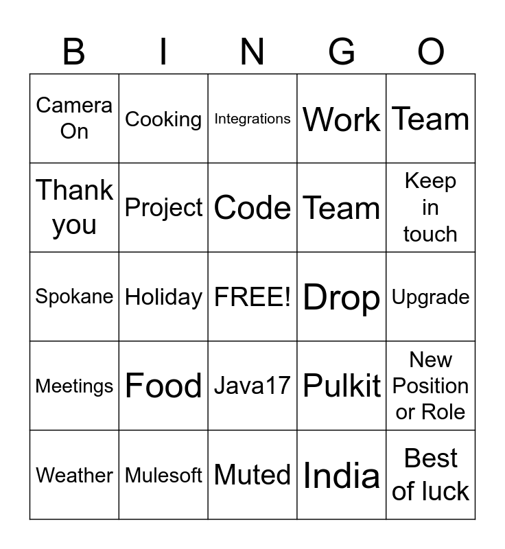 This bingo card has a free space and 28 words: New Position or Role, Miss you, Team, India, Thank you, Integrations, Cooking, Meetings, Drop, Weather, Spokane, Work, Mulesoft, Muted, Keep in touch, Aman, Food, Project, Code, Java17, Camera On, Stand-up, Best of luck, Holiday, Upgrade, Pulkit, Team and Adventure.