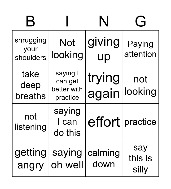 This bingo card has 16 words: saying oh well, practice, giving up, shrugging your shoulders, not listening, Not looking, effort, calming down, take deep breaths, saying I can get better with practice, getting angry, Paying attention, saying I can do this, not looking, trying again and say this is silly.