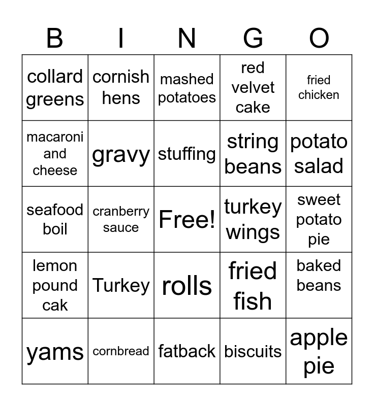 This bingo card has a free space and 24 words: Turkey, cornbread, stuffing, yams, fried chicken, collard greens, macaroni and cheese, cornish hens, turkey wings, rolls, string beans, seafood boil, fried fish, baked beans, gravy, biscuits, sweet potato pie, mashed potatoes, potato salad, cranberry sauce, apple pie, lemon pound cak, red velvet cake and fatback.