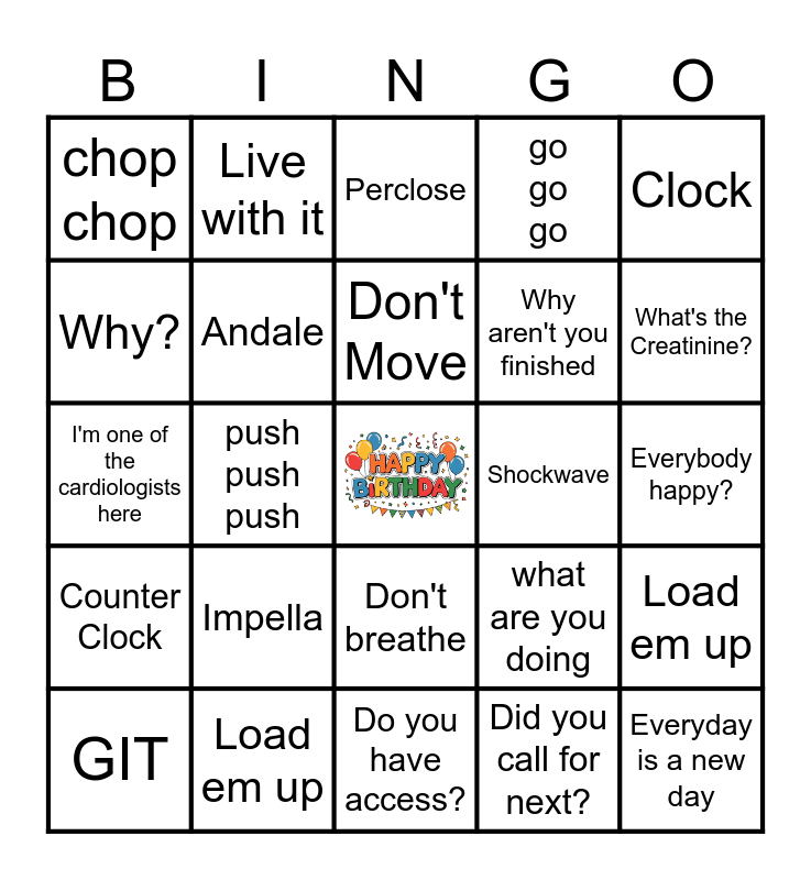 This bingo card has a free space and 39 words: Hellooo, Time out, Boom Boom, Andale, GIT, Don't breathe, Don't Move, High Risk, Clock, Counter Clock, push push push, go go go, Everyday is a new day, Everybody happy?, Shockwave, Impella, Cutter, chop chop, are we done, what are you doing, Why?, Do you have access?, Why aren't you finished, What's the Creatinine?, Where's my lead?, Call for next, Shocky-Shocky, Enjoy, Wonderful, Live with it, If you don't mind, Ring-Ring, Perclose, Load em up, Did you call for next?, Dilly Dilly, Load em up, I'm one of the cardiologists here and GFR.