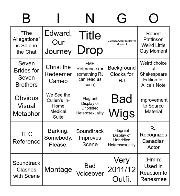 This bingo card has a free space and 25 words: Barking. Somebody. Please., Bad Voiceover, FMB Reference (or something RJ can read as such), Soundtrack Clashes with Scene, Robert Pattinson Weird Little Guy Moment, "The Allegations" is Said in the Chat, Seven Brides for Seven Brothers, Edward, Our Journey, Bad Wigs, Soundtrack Improves Scene, Background Clocks for RJ, Obvious Visual Metaphor, Flagrant Display of Unbridled Heterosexuality, RJ Recognizes Canadian Actor, Christ the Redeemer Cameo, Visceral Reaction to "My Son", Improvement to Source Material, Title Drop, Weird choice of Shakespeare Edition for Alice’s Note, We See the Cullen’s In-Home Medical Suite, :Hmm: Used in Reaction to Renesmee, Montage, TEC Reference, Carlisle/Charlie/Esme Moment and Very 2011/12 Outfit.
