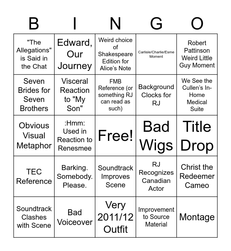 This bingo card has a free space and 24 words: Barking. Somebody. Please., Bad Voiceover, FMB Reference (or something RJ can read as such), Soundtrack Clashes with Scene, Robert Pattinson Weird Little Guy Moment, "The Allegations" is Said in the Chat, Seven Brides for Seven Brothers, Edward, Our Journey, Bad Wigs, Soundtrack Improves Scene, Background Clocks for RJ, Obvious Visual Metaphor, RJ Recognizes Canadian Actor, Christ the Redeemer Cameo, Visceral Reaction to "My Son", Improvement to Source Material, Title Drop, Weird choice of Shakespeare Edition for Alice’s Note, We See the Cullen’s In-Home Medical Suite, :Hmm: Used in Reaction to Renesmee, Montage, TEC Reference, Carlisle/Charlie/Esme Moment and Very 2011/12 Outfit.