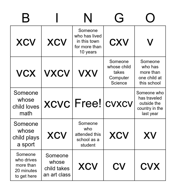 This bingo card has a free space and 48 words: xc, cvx, xcv, xcv, xcv, xcv, xcv, xcv, vcx, xcv, vxcv, cxv, xv, xcv, cvxc, xcv, vxv, cvxcv, cxv, v, xcvc, cv, xcv, Someone whose child takes Computer Science, Someone who is on the PTA, Someone who has more than one child at this school, Someone who drives more than 20 minutes to get here, Someone whose child is in band, choir, or orchestra, Someone who attended this school as a student, Someone whose child plays a sport, Someone who has volunteered at a school event this year, Someone who speaks more than one language at home, Someone whose child takes AP or Honors classes, Someone who has met the principal before, Someone whose child takes an art class, Someone who has a senior this year, Someone whose child is in a school club, Someone who has traveled outside the country in the last year, Someone whose child has a part-time job, Someone who has attended more than one parent mixer, Someone whose child participates in theater or drama, Someone who packed a lunch for their child this week, Someone who has lived in this town for more than 10 years, Someone who is new to the school this year, Someone whose child loves math, Someone who has chaperoned a field trip, Someone whose child has a leadership role at school and Someone who knows the school mascot’s name.