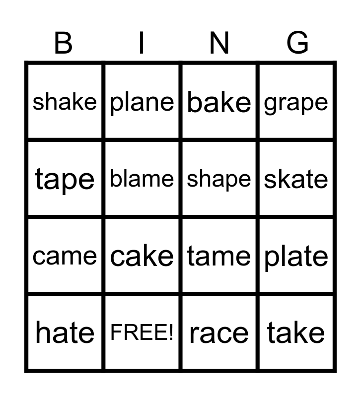 This bingo card has 25 words: name, face, skate, same, tape, shake, blame, plane, FREE!, game, came, tame, table, chase, shape, snake, race, bake, cake, plate, hate, make, take, grape and date.