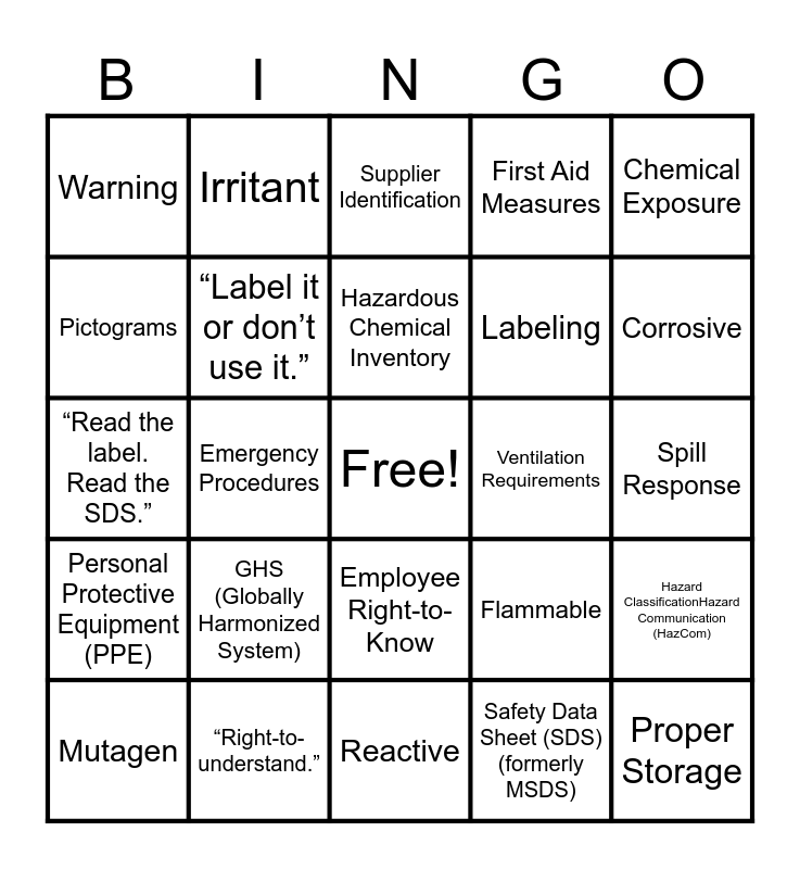 This bingo card has a free space and 40 words: “Know before you use.”, “Read the label. Read the SDS.”, “If you don’t know, ask.”, “Label it or don’t use it.”, “Right-to-understand.”, Employee Right-to-Know, Hazardous Chemical Inventory, Workplace-Specific Training, Chemical Exposure, Personal Protective Equipment (PPE), Emergency Procedures, First Aid Measures, Proper Storage, Spill Response, Ventilation Requirements, GHS (Globally Harmonized System), Danger, Warning, Product Identifier, Supplier Identification, Hazard ClassificationHazard Communication (HazCom), Safety Data Sheet (SDS) (formerly MSDS), Labeling, Pictograms, Signal Word, Hazard Statement, Precautionary Statement, Chemical Hazard, Physical Hazard, Health Hazard, Carcinogen, Mutagen, Toxic, Flammable, Corrosive, Reactive, Explosive, Compressed Gas, Irritant and Sensitizer.