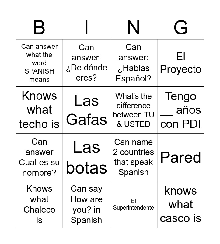 This bingo card has 17 words: Knows what Chaleco is, Can say How are you? in Spanish, Can answer: ¿Hablas Español?, El Proyecto, Can answer Cual es su nombre?, Las Gafas, Can name 2 countries that speak Spanish, Tengo __ años con PDI, Knows what techo is, Las botas, El Superintendente, Pared, Can answer what the word SPANISH means, Can answer:¿De dónde eres?, What's the difference between TU & USTED, knows what casco is and can asnwer:¿De dónde eres?.