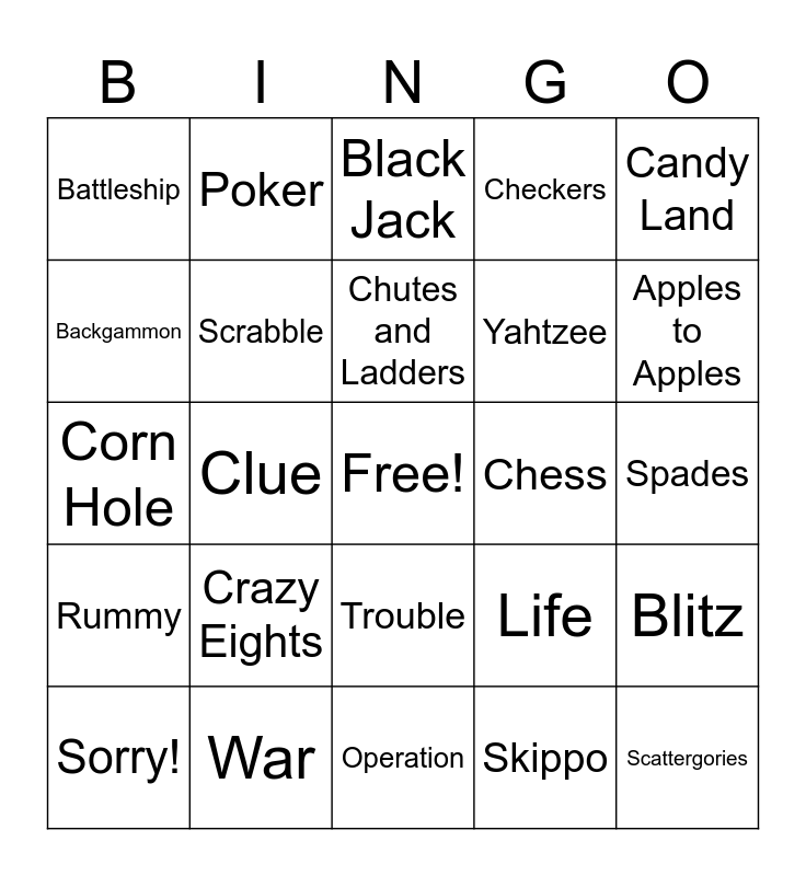 This bingo card has a free space and 39 words: Uno, Jenga, Go Fish, Scrabble, Sorry!, Trouble, Chutes and Ladders, Monopoly, Candy Land, Rummy, Clue, Checkers, Scattergories, Spades, Chess, Crazy Eights, Mancala, Battleship, Connect Four, Life, Backgammon, Operation, Yahtzee, Apples to Apples, Pictionary, Charades, Catan, Taboo, Risk, Poker, Codenames, Sequence, Black Jack, War, Skippo, Old Maid, Blitz, Corn Hole and Ladder Ball.