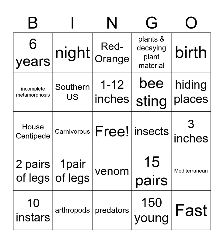 This bingo card has a free space and 24 words: 1pair of legs, arthropods, 1-12 inches, 10 instars, birth, 6 years, incomplete metamorphosis, night, insects, venom, bee sting, House Centipede, 15 pairs, Mediterranean, Southern US, 150 young, 3 inches, Red-Orange, hiding places, Carnivorous, Fast, 2 pairs of legs, plants & decaying plant material and predators.