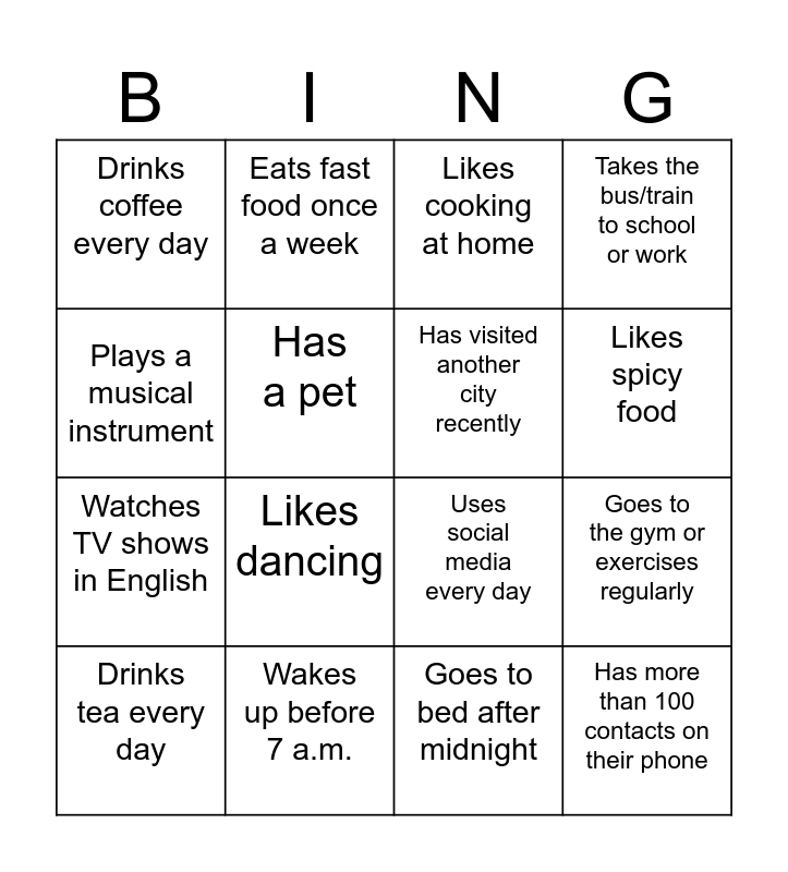 This bingo card has 16 words: Wakes up before 7 a.m., Goes to the gym or exercises regularly, Likes cooking at home, Drinks coffee every day, Watches TV shows in English, Eats fast food once a week, Uses social media every day, Goes to bed after midnight, Plays a musical instrument, Has a pet, Drinks tea every day, Takes the bus/train to school or work, Likes dancing, Likes spicy food, Has visited another city recently and Has more than 100 contacts on their phone.