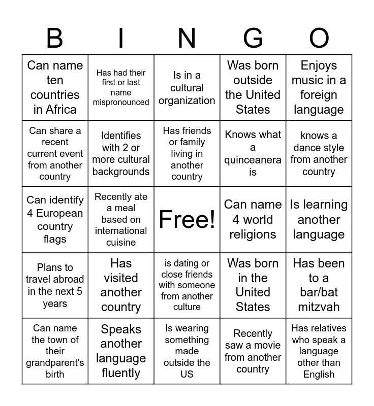 This bingo card has a free space and 24 words: Has visited another country, Speaks another language fluently, Has friends or family living in another country, Can name the town of their grandparent's birth, Enjoys music in a foreign language, Can name ten countries in Africa, Can share a recent current event from another country, Has had their first or last name mispronounced, Can name 4 world religions, is dating or close friends with someone from another culture, Knows what a quinceanera is, Can identify 4 European country flags, Was born in the United States, Has been to a bar/bat mitzvah, Identifies with 2 or more cultural backgrounds, Recently saw a movie from another country, Is learning another language, Is in a cultural organization, knows a dance style from another country, Recently ate a meal based on international cuisine, Has relatives who speak a language other than English, Plans to travel abroad in the next 5 years, Was born outside the United States and Is wearing something made outside the US.