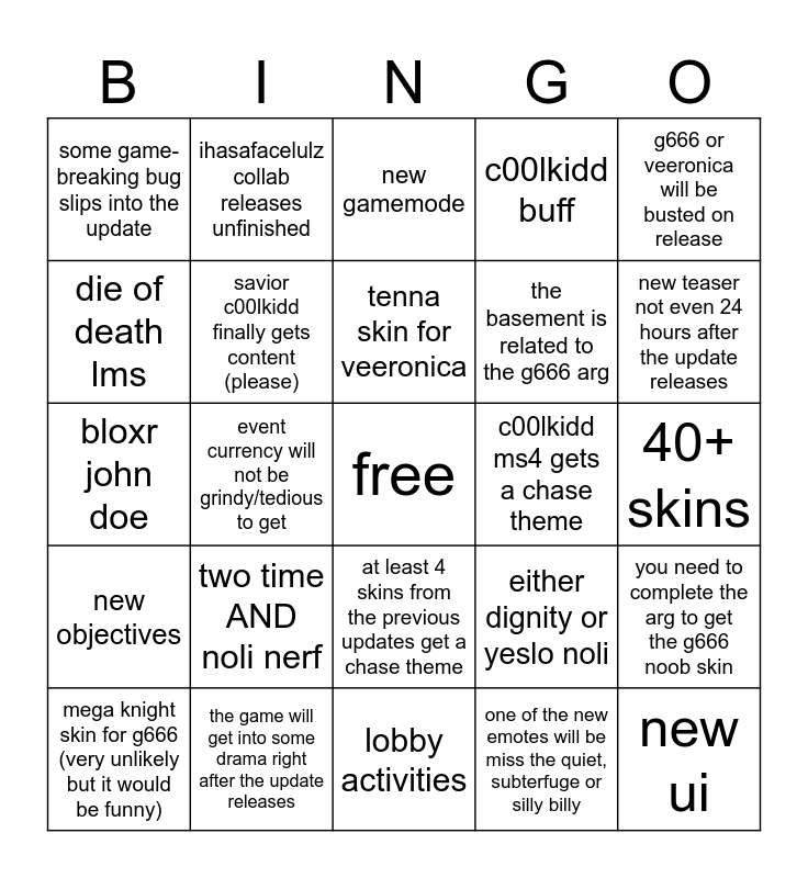This bingo card has a free space and 24 words: two time AND noli nerf, the game will get into some drama right after the update releases, tenna skin for veeronica, mega knight skin for g666 (very unlikely but it would be funny), g666 or veeronica will be busted on release, some game-breaking bug slips into the update, die of death lms, ihasafacelulz collab releases unfinished, c00lkidd ms4 gets a chase theme, at least 4 skins from the previous updates get a chase theme, the basement is related to the g666 arg, bloxr john doe, either dignity or yeslo noli, you need to complete the arg to get the g666 noob skin, savior c00lkidd finally gets content (please), one of the new emotes will be miss the quiet, subterfuge or silly billy, 40+ skins, new gamemode, new teaser not even 24 hours after the update releases, event currency will not be grindy/tedious to get, new ui, new objectives, c00lkidd buff and lobby activities.