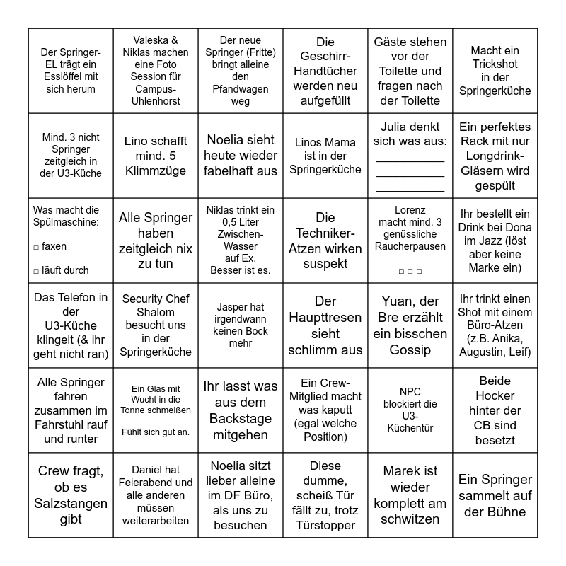 This bingo card has 36 words: Ein Crew-Mitglied macht was kaputt (egal welche Position), Ihr lasst was aus dem Backstage mitgehen, Diese dumme, scheiß Tür fällt zu, trotz Türstopper, Mind. 3 nicht Springer zeitgleich in der U3-Küche, Das Telefon in der U3-Küche klingelt (& ihr geht nicht ran), Die Techniker-Atzen wirken suspekt, Lino schafft mind. 5 Klimmzüge, Noelia sitzt lieber alleine im DF Büro, als uns zu besuchen, Gäste stehen vor der Toilette und fragen nach der Toilette, NPC blockiert die U3-Küchentür, Ein perfektes Rack mit nur Longdrink-Gläsern wird gespült, Die Geschirr-Handtücher werden neu aufgefüllt, Beide Hocker hinter der CB sind besetzt, Alle Springer haben zeitgleich nix zu tun, Linos Mama ist in der Springerküche, Der Springer-EL trägt ein Esslöffel mit sich herum, Alle Springer fahren zusammen im Fahrstuhl rauf und runter, Lorenz macht mind. 3 genüssliche Raucherpausen □ □ □, Was macht die Spülmaschine: □ faxen □ läuft durch, Der neue Springer (Fritte) bringt alleine den Pfandwagen weg, Niklas trinkt ein 0,5 Liter Zwischen-Wasser auf Ex. Besser ist es., Security Chef Shalom besucht uns in der Springerküche, Der Haupttresen sieht schlimm aus, Jasper hat irgendwann keinen Bock mehr, Yuan, der Bre erzählt ein bisschen Gossip, Valeska & Niklas machen eine Foto Session für Campus-Uhlenhorst, Julia denkt sich was aus: __________ __________ __________, Daniel hat Feierabend und alle anderen müssen weiterarbeiten, Noelia sieht heute wieder fabelhaft aus, Macht ein Trickshot in der Springerküche, Ein Springer sammelt auf der Bühne, Crew fragt, ob es Salzstangen gibt, Ihr trinkt einen Shot mit einem Büro-Atzen (z.B. Anika, Augustin, Leif), Ihr bestellt ein Drink bei Dona im Jazz (löst aber keine Marke ein), Ein Glas mit Wucht in die Tonne schmeißen Fühlt sich gut an. and Marek ist wieder komplett am schwitzen.