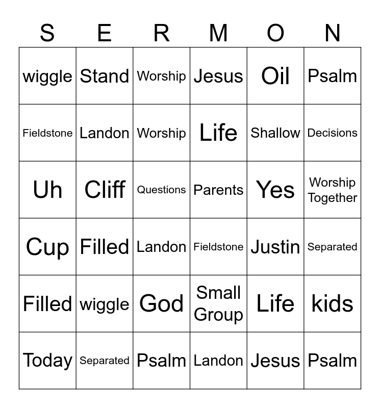 This bingo card has 96 words: Justin, kids, wiggle, Cliff, Powell, Small Group, Cup, Jar, Water, Oil, Separated, Filled, Spirit, Life, Decisions, Psalm, Landon, Uh, Free!, Fieldstone, Parents, Worship, Jesus, God, Worship Together, Justin, kids, wiggle, Cliff, Powell, Small Group, Cup, Jar, Water, Oil, Separated, Filled, Spirit, Life, Decisions, Psalm, Landon, Uh, Fieldstone, Parents, Worship, Jesus, God, Worship Together, Elissa, Promises, Shallow, Yes, No, People, Questions, Day, Today, Fire drill, Justin, kids, wiggle, Cliff, Powell, Small Group, Cup, Jar, Water, Oil, Separated, Filled, Spirit, Life, Decisions, Psalm, Landon, Uh, Fieldstone, Parents, Worship, Jesus, God, Worship Together, Elissa, Promises, Shallow, Yes, No, People, Questions, Day, Today, Fire drill, Church, Stand and Us.