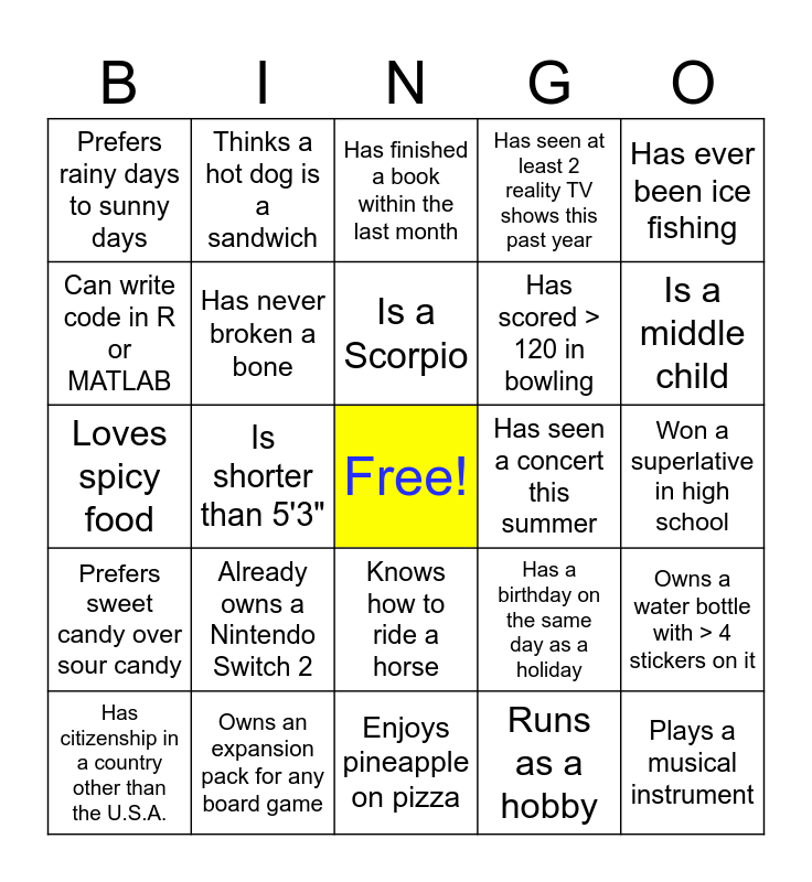This bingo card has a free space and 44 words: Is a pet owner, Plays a musical instrument, Collects rocks, Has citizenship in a country other than the U.S.A., Loves horror movies, Runs as a hobby, Has finished a book within the last month, Has traveled internationally within the past year, Has ever been ice fishing, Owns an expansion pack for any board game, Has seen at least 2 reality TV shows this past year, Has seen a concert this summer, Knows how to ride a horse, Already owns a Nintendo Switch 2, Likes to bake, Enjoys pineapple on pizza, Plays on any sports team (intramural, rec, club, etc...), Loves spicy food, Speaks more than 1 language fluently, Is a middle child, Thinks a hot dog is a sandwich, Has kept a houseplant alive for at least 1 year, Makes fiber arts (crochet, knitting, etc.), Prefers rainy days to sunny days, Has a Costco membership, Won a superlative in high school, Has swam in the Indian, Southern, or Arctic Oceans, Has seen "Twilight" (2008) at least three times, Has a birthday on the same day as a holiday, Prefers sweet candy over sour candy, Does the NYT Crossword semi-religiously, Owns a water bottle with > 4 stickers on it, Has > 3 stickers on their laptop, Can name at least 4 members of BTS, Is shorter than 5'3", Is taller than 6'0", Would be a waterbender (from Avatar the Last Airbender), Has visited > 5 National Parks (in any country), Is a Scorpio, Can write code in R or MATLAB, Has scored > 120 in bowling, Has posted a nature photo on Instagram for Earth Day, Has never broken a bone and Is currently wearing an item of clothing that they thrifted #Sustainable.