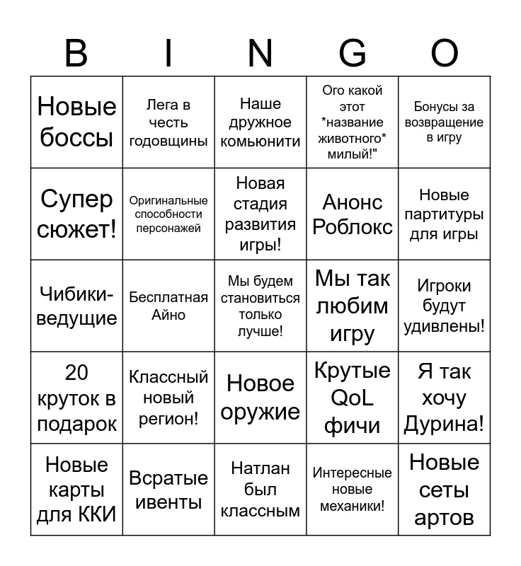 This bingo card has a free space and 24 words: Классный новый регион!, Всратые ивенты, Новая стадия развития игры!, Новые карты для ККИ, Бонусы за возвращение в игру, Новые боссы, Супер сюжет!, Лега в честь годовщины, Мы так любим игру, Новое оружие, Анонс Роблокс, Чибики-ведущие, Крутые QoL фичи, Я так хочу Дурина!, Оригинальные способности персонажей, Интересные новые механики!, Игроки будут удивлены!, Наше дружное комьюнити, Новые партитуры для игры, Бесплатная Айно, Новые сеты артов, 20 круток в подарок, Ого какой этот *название животного* милый!" and Натлан был классным.