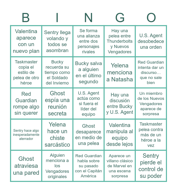 This bingo card has 25 words: Yelena hace un chiste sarcástico, Red Guardian habla sobre su pasado con el Capitán América, Bucky salva a alguien en el último segundo, Ghost atraviesa una pared, U.S. Agent desobedece una orden, Valentina aparece con un nuevo plan, Taskmaster copia el estilo de pelea de otro héroe, Sentry llega volando y todos se asombran, Hay una discusión entre Bucky y U.S. Agent, Ghost desaparece en medio de una pelea, Yelena menciona a Natasha, Red Guardian rompe algo sin querer, Valentina manipula al equipo desde lejos, Taskmaster pelea contra más de un héroe a la vez, Bucky recuerda su tiempo como el Soldado del Invierno, Sentry pierde el control de su poder, Un miembro de los Nuevos Vengadores aparece de sorpresa, Se forma una alianza entre dos personajes rivales, Red Guardian intenta dar un discurso… que no sale bien, Ghost espía una reunión secreta, U.S. Agent actúa como si fuera el líder del equipo, Alguien menciona a los Vengadores originales, Sentry hace algo inesperadamente aterrador, Hay una pelea entre Thunderbolts y Nuevos Vengadores and Aparece un villano clásico de Marvel en una escena sorpresa.