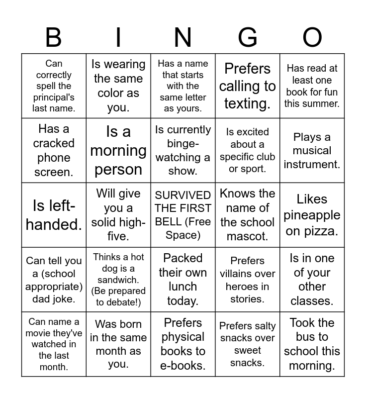 This bingo card has a free space and 28 words: Is in one of your other classes., Got lost at least once today., Is excited about a specific club or sport., Prefers salty snacks over sweet snacks., Has a cracked phone screen., Has a name that starts with the same letter as yours., Is wearing the same color as you., Can tell you a (school appropriate) dad joke., Knows the name of the school mascot., Can name a movie they've watched in the last month., Is left-handed., Prefers calling to texting., Was born in the same month as you., Prefers physical books to e-books., Plays a musical instrument., Is the youngest or oldest sibling in their family., Thinks a hot dog is a sandwich. (Be prepared to debate!), Is a morning person, Is currently binge-watching a show., Packed their own lunch today., Can correctly spell the principal's last name., Plays a video game you've heard of., Took the bus to school this morning., Will give you a solid high-five., Likes pineapple on pizza., Prefers villains over heroes in stories., Has read at least one book for fun this summer. and Doesn't have a TikTok account..