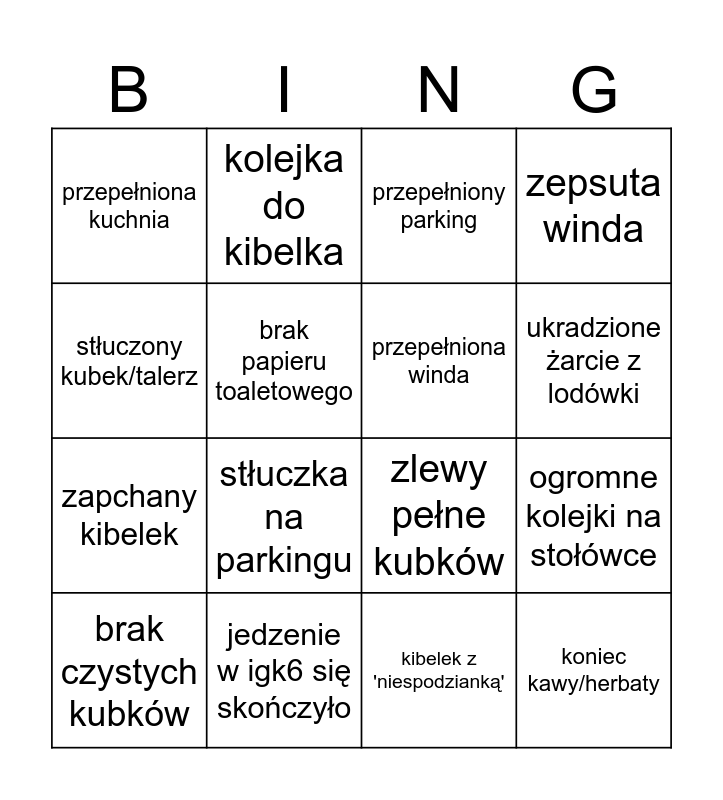 This bingo card has 16 words: jedzenie w igk6 się skończyło, ogromne kolejki na stołówce, przepełniony parking, przepełniona kuchnia, zapchany kibelek, kolejka do kibelka, zlewy pełne kubków, kibelek z 'niespodzianką', stłuczony kubek/talerz, brak papieru toaletowego, brak czystych kubków, zepsuta winda, stłuczka na parkingu, ukradzione żarcie z lodówki, przepełniona winda and koniec kawy/herbaty.