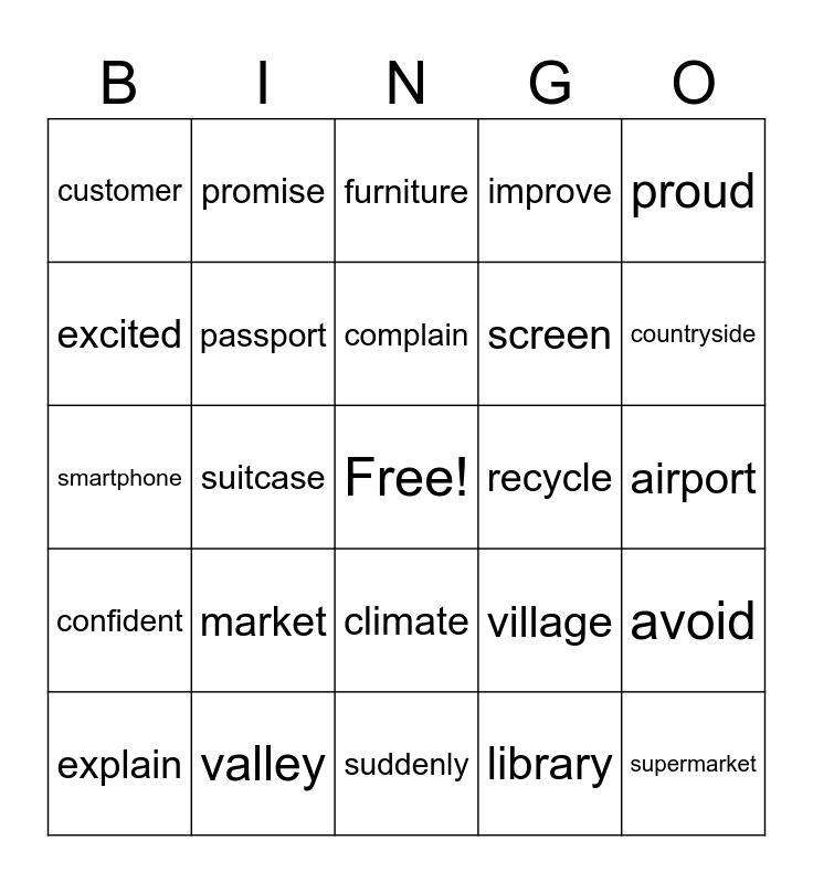 This bingo card has a free space and 30 words: valley, umbrella, suitcase, teenager, customer, furniture, passport, climate, recycle, suddenly, airport, supermarket, library, factory, countryside, disappointed, village, confident, market, proud, smartphone, rarely, promise, screen, excited, improve, avoid, explain, complain and discover.
