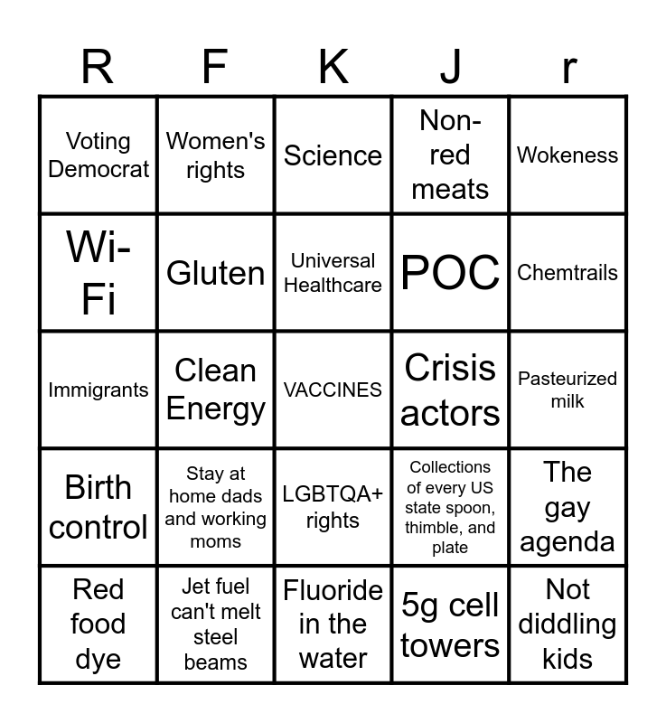 This bingo card has a free space and 24 words: Red food dye, Stay at home dads and working moms, Universal Healthcare, 5g cell towers, Wokeness, Voting Democrat, Women's rights, Science, Crisis actors, Pasteurized milk, Immigrants, Gluten, Collections of every US state spoon, thimble, and plate, The gay agenda, Wi-Fi, Jet fuel can't melt steel beams, Fluoride in the water, Non-red meats, Chemtrails, Birth control, Clean Energy, LGBTQA+ rights, POC and Not diddling kids.