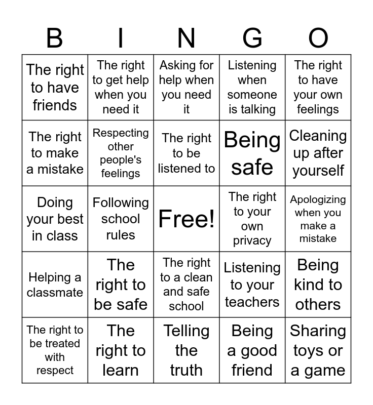 This bingo card has a free space and 24 words: The right to be safe, The right to learn, The right to be listened to, The right to be treated with respect, The right to have your own feelings, The right to have friends, The right to make a mistake, The right to get help when you need it, The right to your own privacy, The right to a clean and safe school, Being safe, Doing your best in class, Listening to your teachers, Being kind to others, Respecting other people's feelings, Being a good friend, Apologizing when you make a mistake, Asking for help when you need it, Cleaning up after yourself, Following school rules, Sharing toys or a game, Helping a classmate, Listening when someone is talking and Telling the truth.