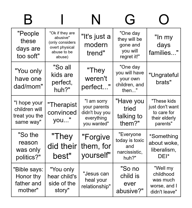 This bingo card has a free space and 24 words: "They did their best", "You only hear child's side of the story", "They weren't perfect...", "Bible says: Honor thy father and mother", "In my days families...", "People these days are too soft", "You only have one dad/mom", "Ok if they are abusive" (only considers overt physical abuse to be abuse), "Have you tried talking to them?", "Forgive them, for yourself", "One day you will have your own children, and then...", "I hope your children will treat you the same way", "Everyone today is toxic and narcissistic, huh?", *Something about woke, liberalism, DEI*, "So all kids are perfect, huh?", "So no child is ever abusive?", "These kids just don't want to care for their elderly parents", "It's just a modern trend", "Ungrateful brats", "Therapist convinced you...", "Well my childhood was much worse, and I didn't leave", "So the reason was only politics?", "One day they will be gone and you will regret it!" and "Jesus can heal your relationship".