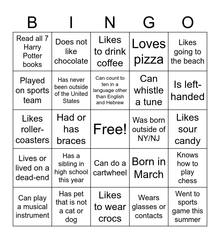 This bingo card has a free space and 24 words: Has a sibling in high school this year, Has pet that is not a cat or dog, Can count to ten in a language other than English and Hebrew, Can play a musical instrument, Likes going to the beach, Read all 7 Harry Potter books, Played on sports team, Does not like chocolate, Was born outside of NY/NJ, Can do a cartwheel, Can whistle a tune, Likes roller-coasters, Born in March, Knows how to play chess, Has never been outside of the United States, Wears glasses or contacts, Likes sour candy, Likes to drink coffee, Is left-handed, Had or has braces, Went to sports game this summer, Lives or lived on a dead-end, Loves pizza and Likes to wear crocs.