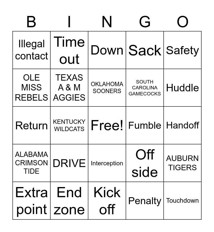 This bingo card has a free space and 44 words: Field goal, Touchdown, Coin toss, Extra point, Quarterback, Penalty, Down, Tackle, Safety, End zone, Sack, Fumble, Interception, DRIVE, Punt, Kick off, Snap, Return, Fair catch, Huddle, Time out, Rushing, Referee, Illegal contact, VANDERBILT COMMODORES, Handoff, Holding, Pass interference, Off side, ALABAMA CRIMSON TIDE, ARKANSAS RAZORBACKS, AUBURN TIGERS, FLORIDA GATORS, GEORGIA BULLDOGS, KENTUCKY WILDCATS, LSU TIGERS, MISSISSIPPI STATE BULLDOGS, MISSOURI TIGERS, OKLAHOMA SOONERS, OLE MISS REBELS, SOUTH CAROLINA GAMECOCKS, TENNESSEE VOLUNTEERS, TEXAS A & M AGGIES and TEXAS LONGHORNS.